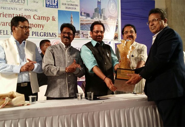 NATIONAL AWARD WINNER 2015 - 2016 awarded to Mr. Rahatullah Shaikh of "Rahat Travels Of India" Rahat Travels Of India again won "NATIONAL Award, for Best Hajj & Umrah Tour. 2015 - 2016", in the category of Hajj & Umrah, at Indo Gulf Awards held at Hajj House in Mumbai on 19th August 2016. The Award was given by Minister of Minority Affairs Mr. Mukhtar Abbas Naqvi at a function held at Hajj House, Crawford Market. Mumbai. This award is a recognition of continued Hardwork & Dedication put in by Rahat Team.
